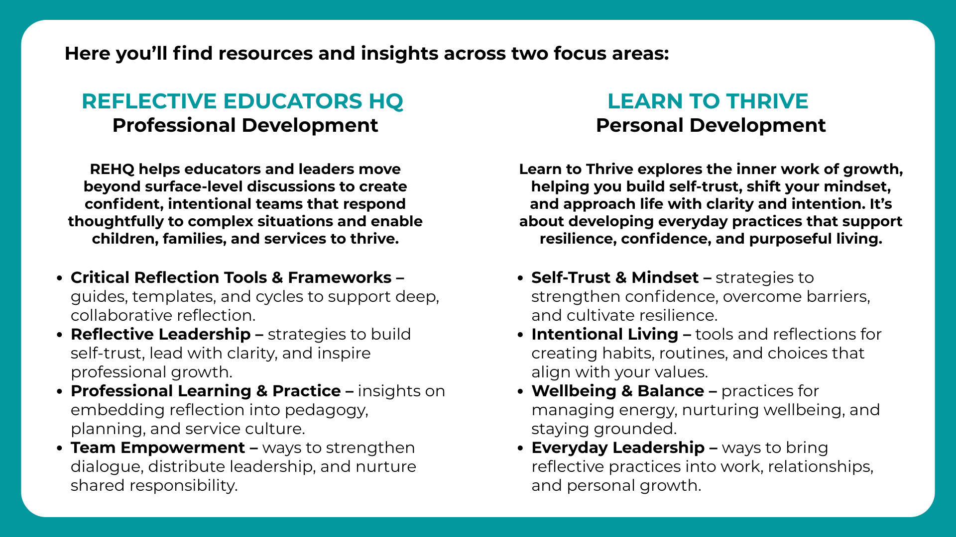 The Reflective Educators HQ Blog brings together insights, strategies, and tools to support growth in both professional and personal spheres. Our articles help educators, leaders, and individuals pause, reflect, and act with greater clarity and purpose. Whether you’re guiding a team of educators or navigating your own journey of growth, this blog offers practical guidance and reflective insights to help you thrive.