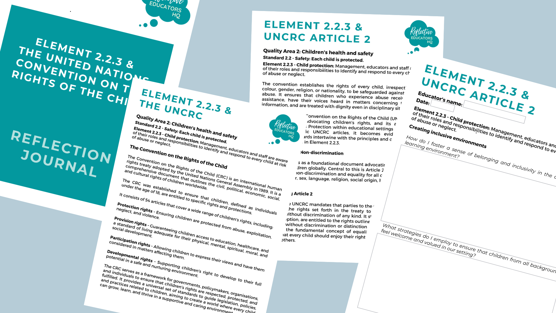 The included 68 page journal encourages critical reflection on programming and practices, specifically focusing on Element 2.2.3 - Child Protection and related articles of the United Nations Convention on the Rights of the Child. It provides educators with a comprehensive space for in-depth reflection on child protection practices.